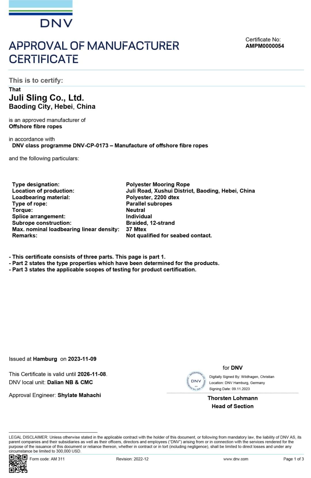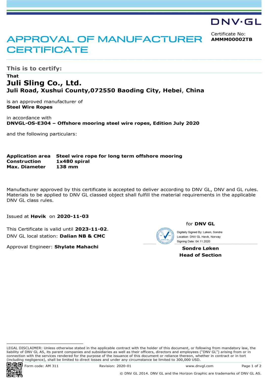 (系泊索DNV工廠認(rèn)可證書)