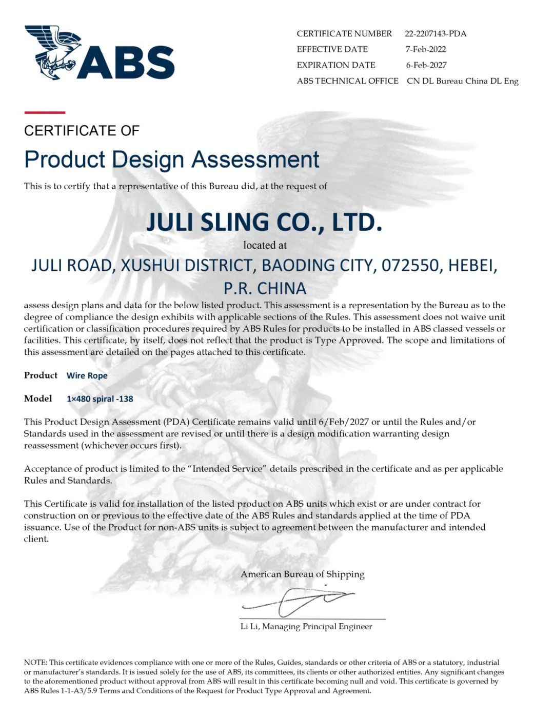 (系泊鋼絲繩ABS認(rèn)可證書)