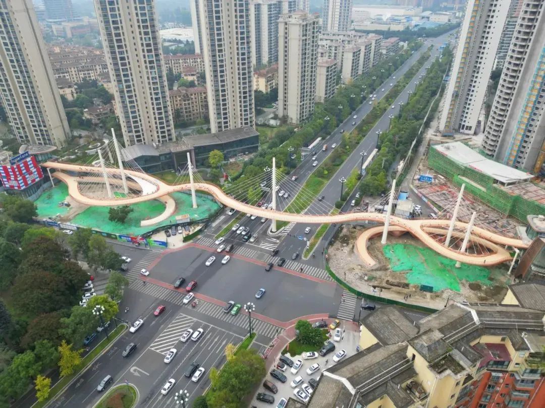 蜀龍路跨線橋主線全長249.6米,共包含7根索塔、100根鋼索以及24節段鋼箱梁。全橋采用鋼結構實現靈動造型,沒有一座橋墩,通過7根索塔拉起1000余噸橋體。