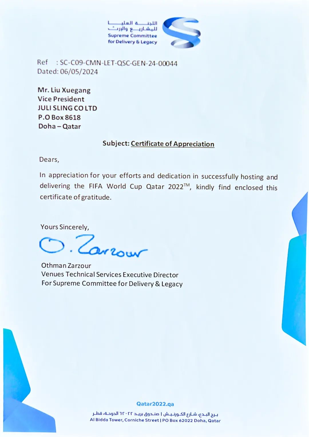 隨著2024年溫暖的春意,我們收到了來(lái)自項(xiàng)目業(yè)主——卡塔爾交付和遺產(chǎn)最高委員會(huì)(SUPREME COMMITTEE FOR DELIVERY & LEGACY)的感謝信及認(rèn)可證書(shū),這是對(duì)我們過(guò)往努力的最佳肯定。信中的每一個(gè)字句,都是對(duì)我們團(tuán)隊(duì)辛勤工作和不懈努力的高度認(rèn)可。這份榮耀不僅屬于我們,也屬于每一位支持和關(guān)注我們項(xiàng)目的人。您們的信任和支持是我們最寶貴的財(cái)富,是我們不斷前進(jìn)的動(dòng)力源泉。