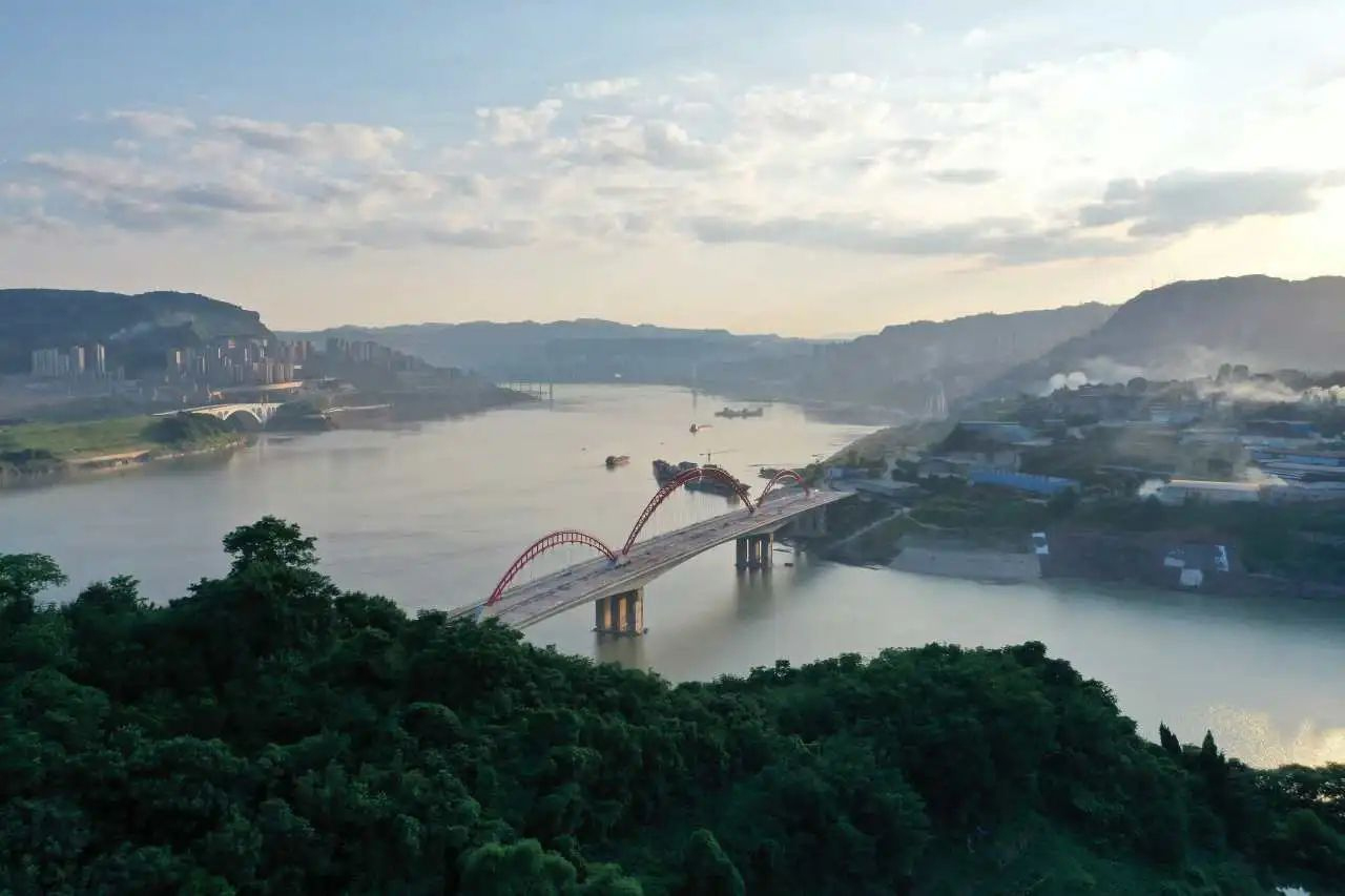 青山綠水之間,一座大橋騰空而起,不僅方便了當地人民交通出行,促進經濟發展,而且在川渝大地,長江之側形成了一道亮麗的風景線,兼具美學和實用價值。