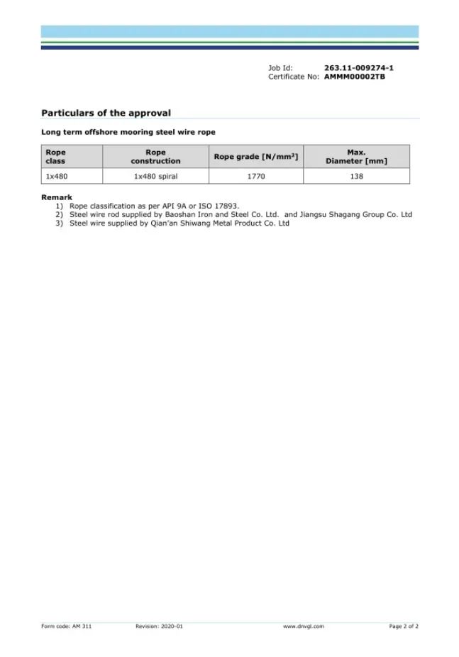 2020年11月,巨力索具取得了永久系泊用單股涂塑鋼絲繩的DNV·GL工廠認可證書,成為國內(nèi)首家通過該類鋼絲繩DNV·GL工廠認可的廠家。