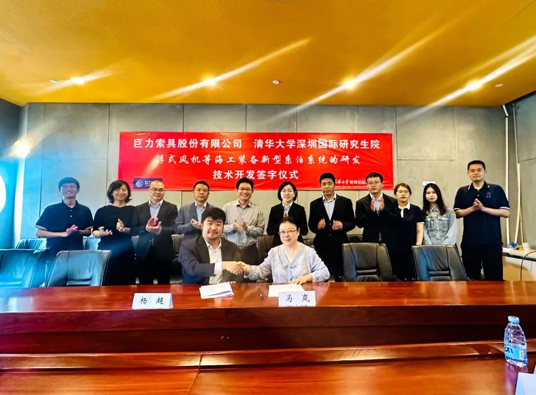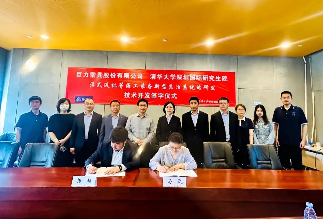 2023年4月13日,巨力索具與清華大學深圳國際研究生院就浮式風機等海上漂浮式構筑物新型系泊系統(tǒng)的研發(fā)達成技術開發(fā)合作關系并舉行簽約儀式。