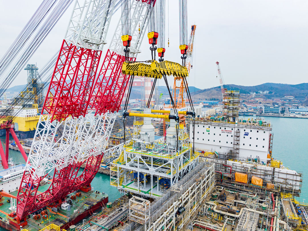 近日,中集來福士浮式生產儲油船(FPSO)重為3669噸的S20、2960噸的P60、2766噸的P20三大模塊吊裝完成。巨力索具為其提供了承載量為3000噸、2500噸的平衡梁梁式吊具、卸扣、無接頭繩索等產品,并為保證吊裝的順利進行制訂了嚴謹的吊裝方案。