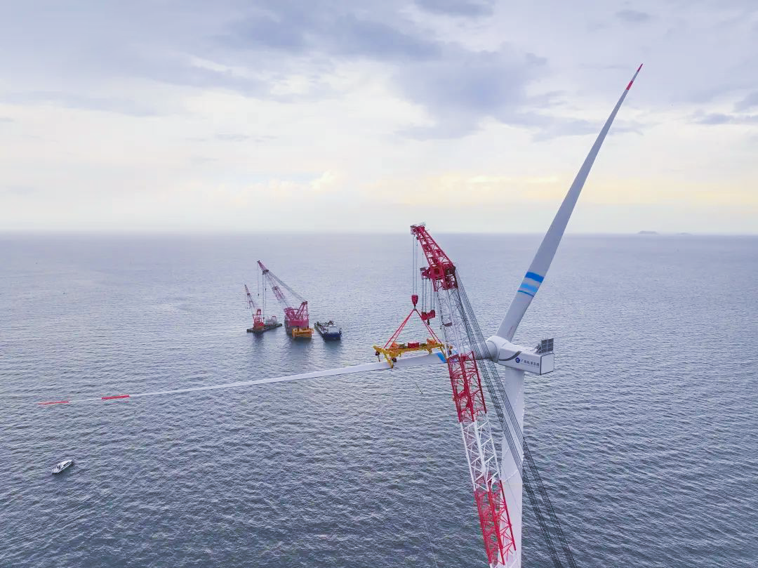 據(jù)悉,本次吊裝的風(fēng)電機組單支葉片長111.5米、重42噸,葉輪掃風(fēng)面積40627平方米。